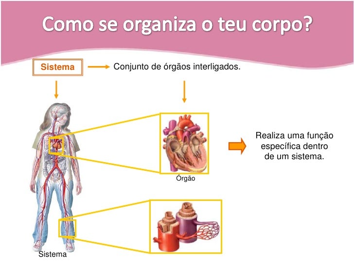 5. 5. Órgão<br />Sistema<br />Conjunto de órgãos interligados.<br />Sistema<br />Realiza uma função específica dentro de um sistema.<br />Como se organiza o teu corpo?<br />