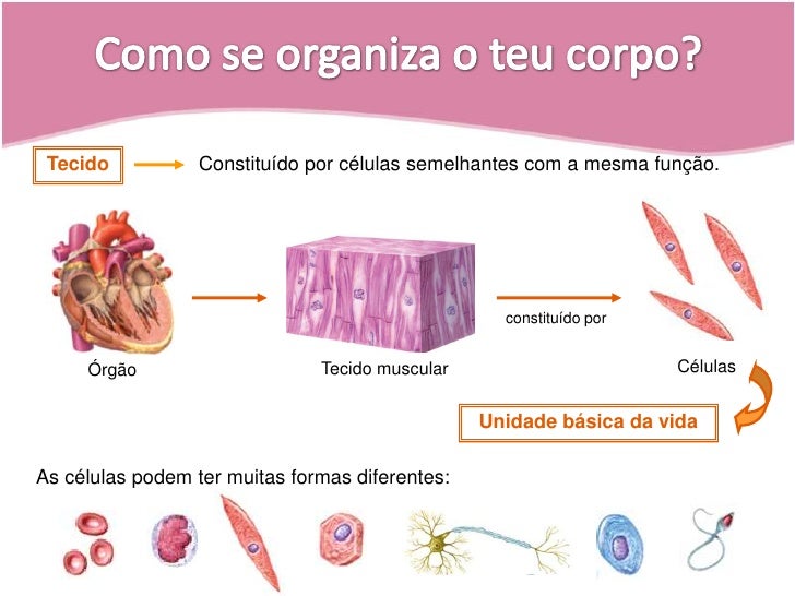 7. 7. constituído por<br />Células<br />Tecido muscular<br />Órgão<br />Constituído por células semelhantes com a mesma função.<br />Tecido<br />Unidade básica da vida<br />As células podem ter muitas formas diferentes: <br />Como se organiza o teu corpo?<br />