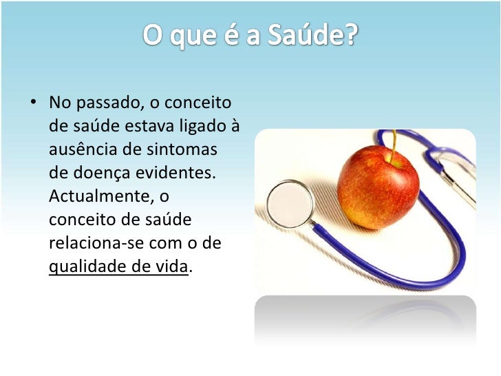 8. 8. O que é a Saúde?<br />No passado, o conceito de saúde estava ligado à ausência de sintomas de doença evidentes. Actualmente, o conceito de saúde relaciona-se com o de qualidade de vida.<br />