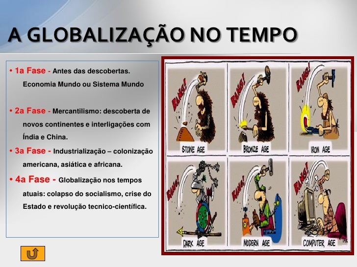 9. 9. A GLOBALIZAÇÃO NO TEMPO• 1a Fase - Antes das descobertas. Economia Mundo ou Sistema Mundo• 2a Fase - Mercantilismo: descoberta de novos continentes e interligações com Índia e China.• 3a Fase - Industrialização – colonização americana, asiática e africana.• 4a Fase - Globalização nos tempos atuais: colapso do socialismo, crise do Estado e revolução tecnico-científica.