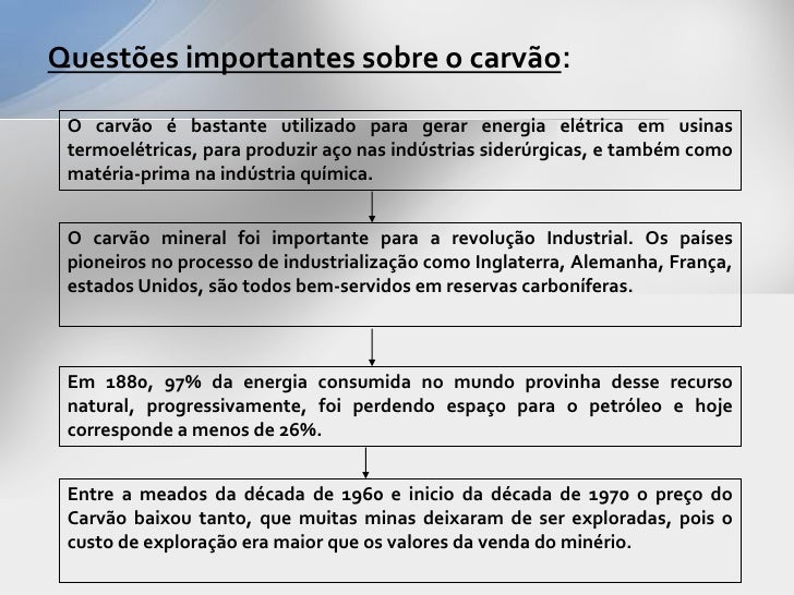 63. 63. Questões importantes sobre o carvão: O carvão é bastante utilizado para gerar energia elétrica em usinas termoelétricas, para produzir aço nas indústrias siderúrgicas, e também como matéria-prima na indústria química. O carvão mineral foi importante para a revolução Industrial. Os países pioneiros no processo de industrialização como Inglaterra, Alemanha, França, estados Unidos, são todos bem-servidos em reservas carboníferas. Em 1880, 97% da energia consumida no mundo provinha desse recurso natural, progressivamente, foi perdendo espaço para o petróleo e hoje corresponde a menos de 26%. Entre a meados da década de 1960 e inicio da década de 1970 o preço do Carvão baixou tanto, que muitas minas deixaram de ser exploradas, pois o custo de exploração era maior que os valores da venda do minério.