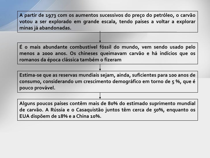 64. 64. A partir de 1973 com os aumentos sucessivos do preço do petróleo, o carvãovotou a ser explorado em grande escala, tendo países a voltar a explorarminas já abandonadas.É o mais abundante combustível fóssil do mundo, vem sendo usado pelomenos a 2000 anos. Os chineses queimavam carvão e há indícios que osromanos da época clássica também o fizeramEstima-se que as reservas mundiais sejam, ainda, suficientes para 100 anos deconsumo, considerando um crescimento demográfico em torno de 5 %, que épouco provável.Alguns poucos países contêm mais de 80% do estimado suprimento mundialde carvão. A Rússia e o Casaquistão juntos têm cerca de 50%, enquanto osEUA dispõem de 18% e a China 10%.