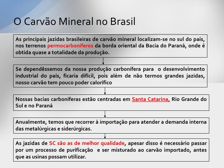 65. 65. O Carvão Mineral no BrasilAs principais jazidas brasileiras de carvão mineral localizam-se no sul do país,nos terrenos permocarboníferos da borda oriental da Bacia do Paraná, onde éobtida quase a totalidade da produção.Se dependêssemos da nossa produção carbonífera para o desenvolvimentoindustrial do país, ficaria difícil, pois além de não termos grandes jazidas,nosso carvão tem pouco poder caloríficoNossas bacias carboníferas estão centradas em Santa Catarina, Rio Grande doSul e no ParanáAnualmente, temos que recorrer á importação para atender a demanda internadas metalúrgicas e siderúrgicas.As jazidas de SC são as de melhor qualidade, apesar disso é necessário passarpor um processo de purificação e ser misturado ao carvão importado, antesque as usinas possam utilizar.