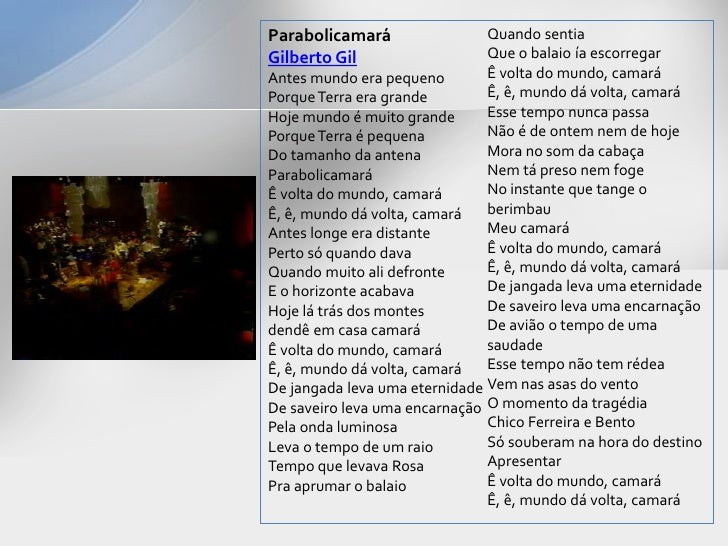 13. 13. Parabolicamará Quando sentiaGilberto Gil Que o balaio ía escorregarAntes mundo era pequeno Ê volta do mundo, camaráPorque Terra era grande Ê, ê, mundo dá volta, camaráHoje mundo é muito grande Esse tempo nunca passaPorque Terra é pequena Não é de ontem nem de hojeDo tamanho da antena Mora no som da cabaçaParabolicamará Nem tá preso nem fogeÊ volta do mundo, camará No instante que tange oÊ, ê, mundo dá volta, camará berimbauAntes longe era distante Meu camaráPerto só quando dava Ê volta do mundo, camaráQuando muito ali defronte Ê, ê, mundo dá volta, camaráE o horizonte acabava De jangada leva uma eternidadeHoje lá trás dos montes De saveiro leva uma encarnaçãodendê em casa camará De avião o tempo de umaÊ volta do mundo, camará saudadeÊ, ê, mundo dá volta, camará Esse tempo não tem rédeaDe jangada leva uma eternidade Vem nas asas do ventoDe saveiro leva uma encarnação O momento da tragédiaPela onda luminosa Chico Ferreira e BentoLeva o tempo de um raio Só souberam na hora do destinoTempo que levava Rosa ApresentarPra aprumar o balaio Ê volta do mundo, camará Ê, ê, mundo dá volta, camará