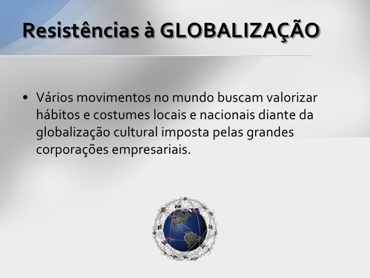 14. 14. Resistências à GLOBALIZAÇÃO• Vários movimentos no mundo buscam valorizar hábitos e costumes locais e nacionais diante da globalização cultural imposta pelas grandes corporações empresariais.