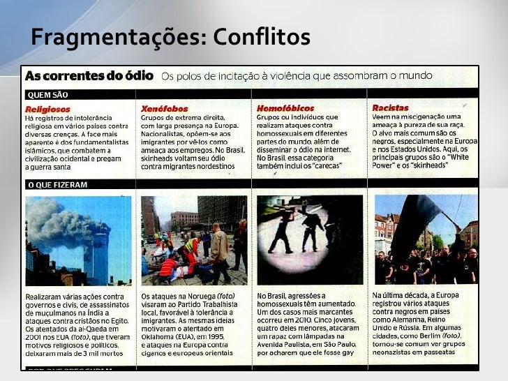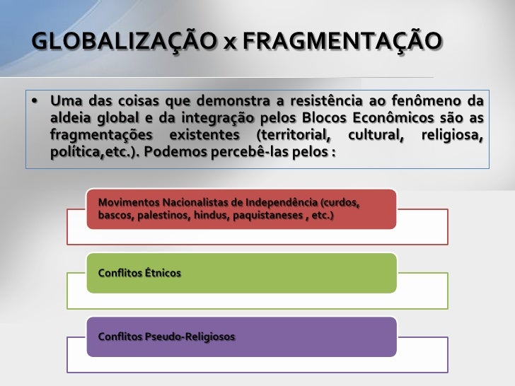 15. 15. GLOBALIZAÇÃO x FRAGMENTAÇÃO• Uma das coisas que demonstra a resistência ao fenômeno da aldeia global e da integração pelos Blocos Econômicos são as fragmentações existentes (territorial, cultural, religiosa, política,etc.). Podemos percebê-las pelos : Movimentos Nacionalistas de Independência (curdos, bascos, palestinos, hindus, paquistaneses , etc.) Conflitos Étnicos Conflitos Pseudo-Religiosos