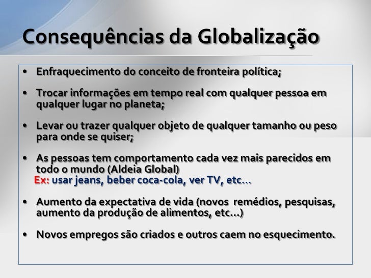 21. 21. Consequências da Globalização• Enfraquecimento do conceito de fronteira política;• Trocar informações em tempo real com qualquer pessoa em qualquer lugar no planeta;• Levar ou trazer qualquer objeto de qualquer tamanho ou peso para onde se quiser;• As pessoas tem comportamento cada vez mais parecidos em todo o mundo (Aldeia Global) Ex: usar jeans, beber coca-cola, ver TV, etc...• Aumento da expectativa de vida (novos remédios, pesquisas, aumento da produção de alimentos, etc...)• Novos empregos são criados e outros caem no esquecimento.