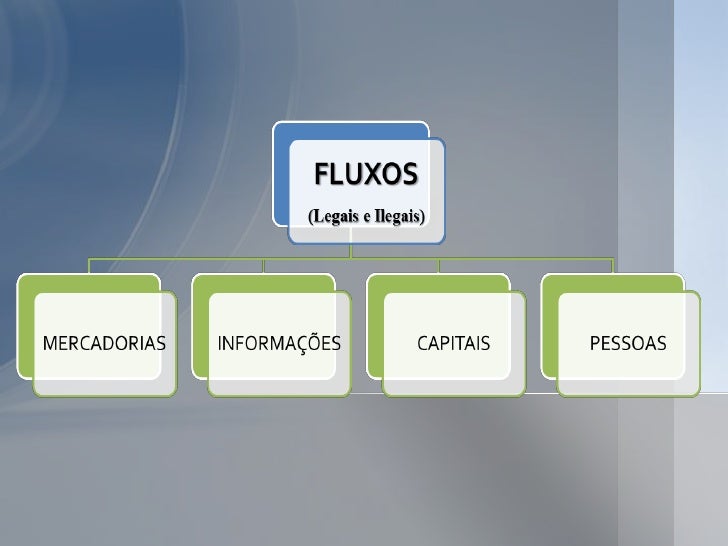 26. 26. GLOBALIZAÇÃOFLUXOS x REDES (Legais x Ilegais) FLUXOS São mais intensos nos países desenvolvidos (Legais e Ilegais)MERCADORIAS INFORMAÇÕES CAPITAIS PESSOAS São mais eficientes nos REDES países desenvolvidos TRANSPORTES COMUNICAÇÃO ENERGIA
