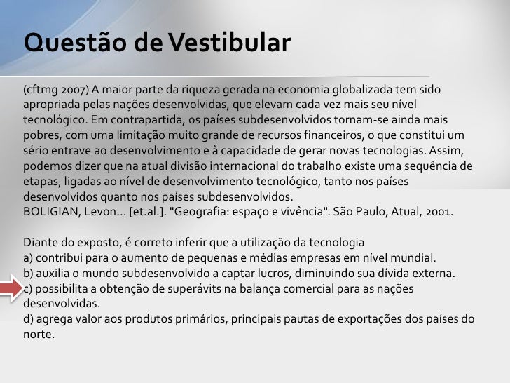 30. 30. Questão de Vestibular(cftmg 2007) A maior parte da riqueza gerada na economia globalizada tem sidoapropriada pelas nações desenvolvidas, que elevam cada vez mais seu níveltecnológico. Em contrapartida, os países subdesenvolvidos tornam-se ainda maispobres, com uma limitação muito grande de recursos financeiros, o que constitui umsério entrave ao desenvolvimento e à capacidade de gerar novas tecnologias. Assim,podemos dizer que na atual divisão internacional do trabalho existe uma sequência deetapas, ligadas ao nível de desenvolvimento tecnológico, tanto nos paísesdesenvolvidos quanto nos países subdesenvolvidos.BOLIGIAN, Levon... [et.al.]. "Geografia: espaço e vivência". São Paulo, Atual, 2001.Diante do exposto, é correto inferir que a utilização da tecnologiaa) contribui para o aumento de pequenas e médias empresas em nível mundial.b) auxilia o mundo subdesenvolvido a captar lucros, diminuindo sua dívida externa.c) possibilita a obtenção de superávits na balança comercial para as naçõesdesenvolvidas.d) agrega valor aos produtos primários, principais pautas de exportações dos países donorte.