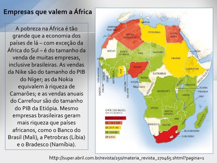 33. 33. Empresas que valem a África A pobreza na África é tão grande que a economia dos países de lá – com exceção da África do Sul – é do tamanho da venda de muitas empresas, inclusive brasileiras. As vendas da Nike são do tamanho do PIB do Níger; as da Nokia equivalem à riqueza de Camarões; e as vendas anuais do Carrefour são do tamanho do PIB da Etiópia. Mesmo empresas brasileiras geram mais riqueza que países africanos, como o Banco do Brasil (Mali), a Petrobras (Líbia) e o Bradesco (Namíbia). http://super.abril.com.br/revista/250/materia_revista_270465.shtml?pagina=1