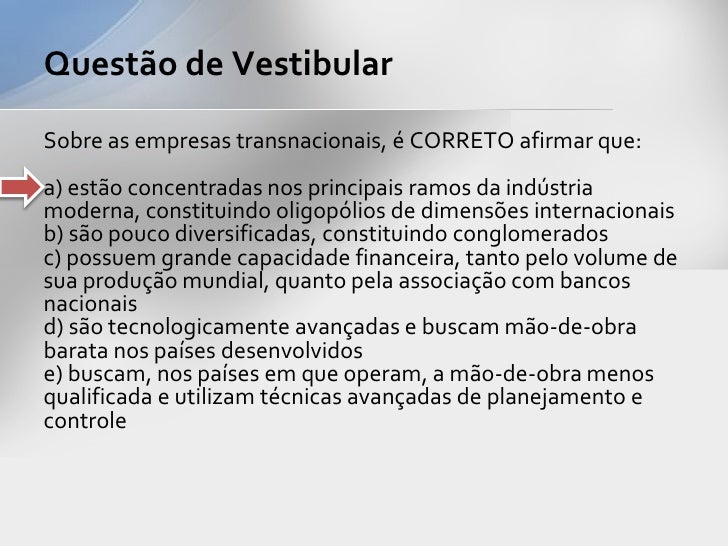 34. 34. Questão de VestibularSobre as empresas transnacionais, é CORRETO afirmar que:a) estão concentradas nos principais ramos da indústriamoderna, constituindo oligopólios de dimensões internacionaisb) são pouco diversificadas, constituindo conglomeradosc) possuem grande capacidade financeira, tanto pelo volume desua produção mundial, quanto pela associação com bancosnacionaisd) são tecnologicamente avançadas e buscam mão-de-obrabarata nos países desenvolvidose) buscam, nos países em que operam, a mão-de-obra menosqualificada e utilizam técnicas avançadas de planejamento econtrole