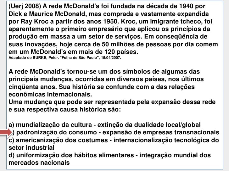 36. 36. (Uerj 2008) A rede McDonalds foi fundada na década de 1940 porDick e Maurice McDonald, mas comprada e vastamente expandidapor Ray Kroc a partir dos anos 1950. Kroc, um imigrante tcheco, foiaparentemente o primeiro empresário que aplicou os princípios daprodução em massa a um setor de serviços. Em conseqüência desuas inovações, hoje cerca de 50 milhões de pessoas por dia comemem um McDonalds em mais de 120 países.Adaptado de BURKE, Peter. "Folha de São Paulo", 15/04/2007.A rede McDonalds tornou-se um dos símbolos de algumas dasprincipais mudanças, ocorridas em diversos países, nos últimoscinqüenta anos. Sua história se confunde com a das relaçõeseconômicas internacionais.Uma mudança que pode ser representada pela expansão dessa redee sua respectiva causa histórica são:a) mundialização da cultura - extinção da dualidade local/globalb) padronização do consumo - expansão de empresas transnacionaisc) americanização dos costumes - internacionalização tecnológica dosetor industriald) uniformização dos hábitos alimentares - integração mundial dosmercados nacionais