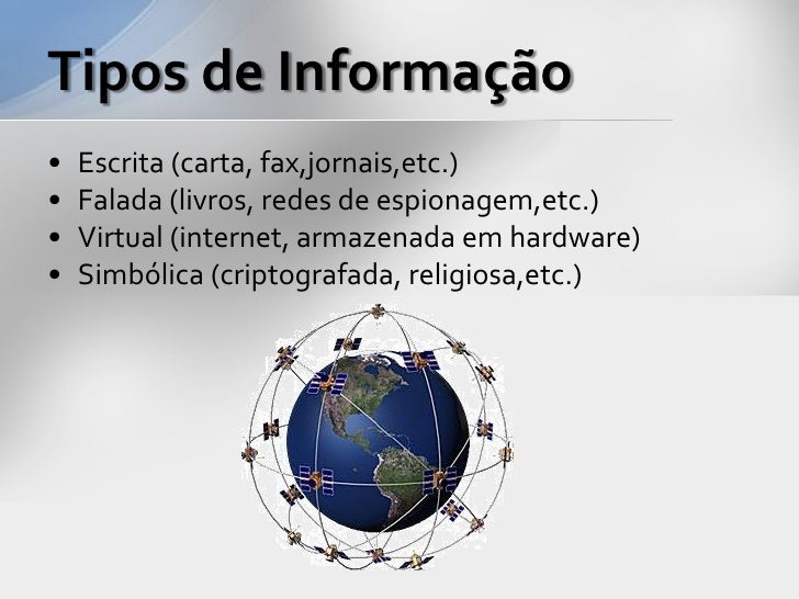 39. 39. Tipos de Informação• Escrita (carta, fax,jornais,etc.)• Falada (livros, redes de espionagem,etc.)• Virtual (internet, armazenada em hardware)• Simbólica (criptografada, religiosa,etc.)