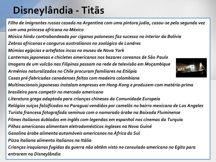 7. 7. Disneylândia - TitãsFilho de imigrantes russos casado na Argentina com uma pintora judia, casou-se pela segunda vezcom uma princesa africana no MéxicoMúsica hindu contrabandeada por ciganos poloneses faz sucesso no interior da BolíviaZebras africanas e cangurus australianos no zoológico de LondresMúmias egípcias e artefatos incas no museu de Nova YorkLanternas japonesas e chicletes americanos nos bazares coreanos de São PauloImagens de um vulcão nas Filipinas passam na rede de televisão em MoçambiqueArmênios naturalizados no Chile procuram familiares na EtiópiaCasas pré-fabricadas canadenses feitas com madeira colombianaMultinacionais japonesas instalam empresas em Hong-Kong e produzem com matéria-primabrasileira para competir no mercado americanoLiteratura grega adaptada para crianças chinesas da Comunidade EuropeiaRelógios suíços falsificados no Paraguai vendidos por camelôs no bairro mexicano de Los AngelesTurista francesa fotografada seminua com o namorado árabe na Baixada FluminenseFilmes italianos dublados em inglês com legendas em espanhol nos cinemas da TurquiaPilhas americanas alimentam eletrodomésticos ingleses na Nova GuinéGasolina árabe alimenta automóveis americanos na África do SulPizza italiana alimenta italianos na ItáliaCrianças iraquianas fugidas da guerra não obtêm visto no consulado americano no Egito paraentrarem na Disneylândia