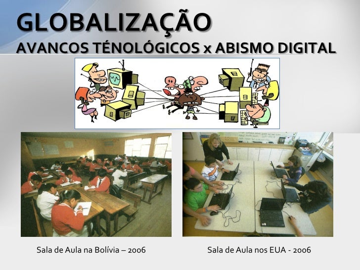 51. 51. GLOBALIZAÇÃOAVANCOS TÉNOLÓGICOS x ABISMO DIGITAL Sala de Aula na Bolívia – 2006 Sala de Aula nos EUA - 2006