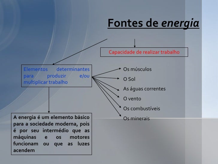 53. 53. Fontes de energia Capacidade de realizar trabalho Elementos determinantes Os músculos para produzir e/ou O Sol multiplicar trabalho As águas correntes O vento Os combustíveisA energia é um elemento básico Os mineraispara a sociedade moderna, poisé por seu intermédio que asmáquinas e os motoresfuncionam ou que as luzesacendem
