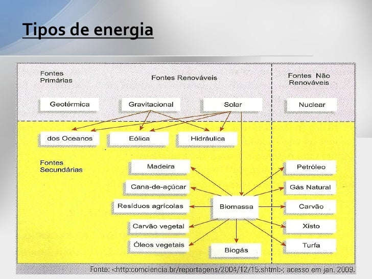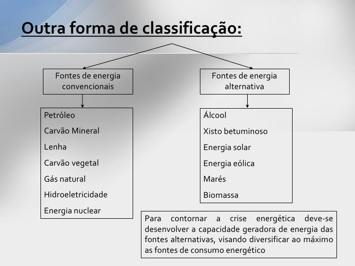 59. 59. Outra forma de classificação: Fontes de energia Fontes de energia convencionais alternativa Petróleo Álcool Carvão Mineral Xisto betuminoso Lenha Energia solar Carvão vegetal Energia eólica Gás natural Marés Hidroeletricidade Biomassa Energia nuclear Para contornar a crise energética deve-se desenvolver a capacidade geradora de energia das fontes alternativas, visando diversificar ao máximo as fontes de consumo energético