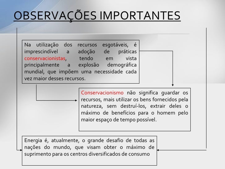 55. 55. OBSERVAÇÕES IMPORTANTES Na utilização dos recursos esgotáveis, é imprescindível a adoção de práticas conservacionistas, tendo em vista principalmente a explosão demográfica mundial, que impõem uma necessidade cada vez maior desses recursos. Conservacionismo não significa guardar os recursos, mais utilizar os bens fornecidos pela natureza, sem destruí-los, extrair deles o máximo de benefícios para o homem pelo maior espaço de tempo possível. Energia é, atualmente, o grande desafio de todas as nações do mundo, que visam obter o máximo de suprimento para os centros diversificados de consumo