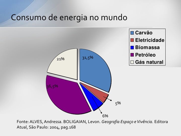 56. 56. Consumo de energia no mundo Carvão Eletricidade Biomassa 31,5% Petróleo 21% Gás natural 36,5% 5% 6% Fonte: ALVES, Andressa. BOLIGAIAN, Levon. Geografia Espaço e Vivência. Editora Atual, São Paulo: 2004, pag.168