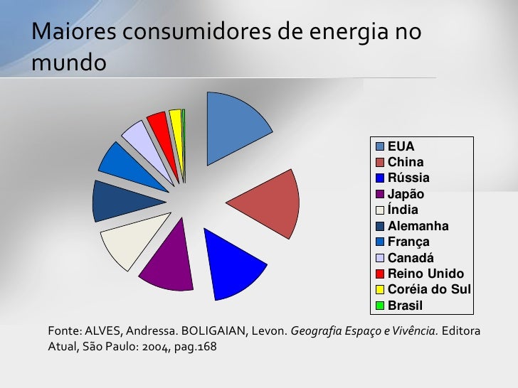 57. 57. Maiores consumidores de energia nomundo EUA China Rússia Japão Índia Alemanha França Canadá Reino Unido Coréia do Sul Brasil Fonte: ALVES, Andressa. BOLIGAIAN, Levon. Geografia Espaço e Vivência. Editora Atual, São Paulo: 2004, pag.168