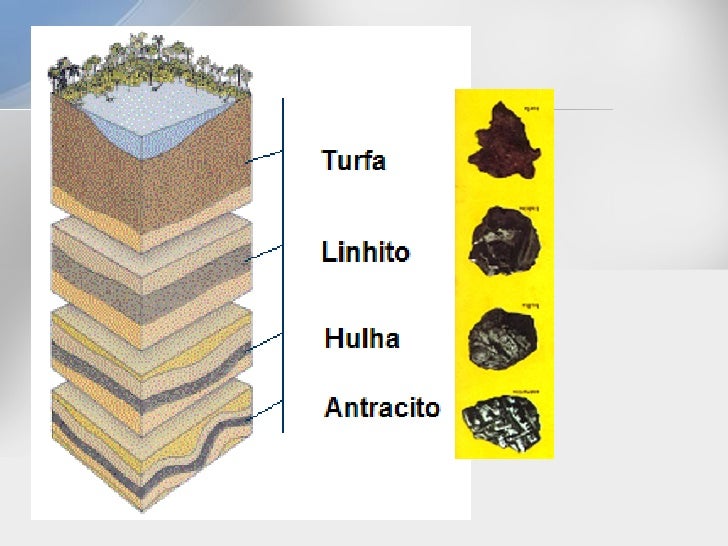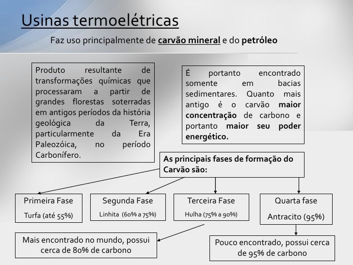60. 60. Usinas termoelétricas Faz uso principalmente de carvão mineral e do petróleo Produto resultante de É portanto encontrado transformações químicas que somente em bacias processaram a partir de sedimentares. Quanto mais grandes florestas soterradas antigo é o carvão maior em antigos períodos da história concentração de carbono e geológica da Terra, portanto maior seu poder particularmente da Era energético. Paleozóica, no período Carbonífero. As principais fases de formação do Carvão são:Primeira Fase Segunda Fase Terceira Fase Quarta faseTurfa (até 55%) Linhita (60% a 75%) Hulha (75% a 90%) Antracito (95%)Mais encontrado no mundo, possui Pouco encontrado, possui cerca cerca de 80% de carbono de 95% de carbono