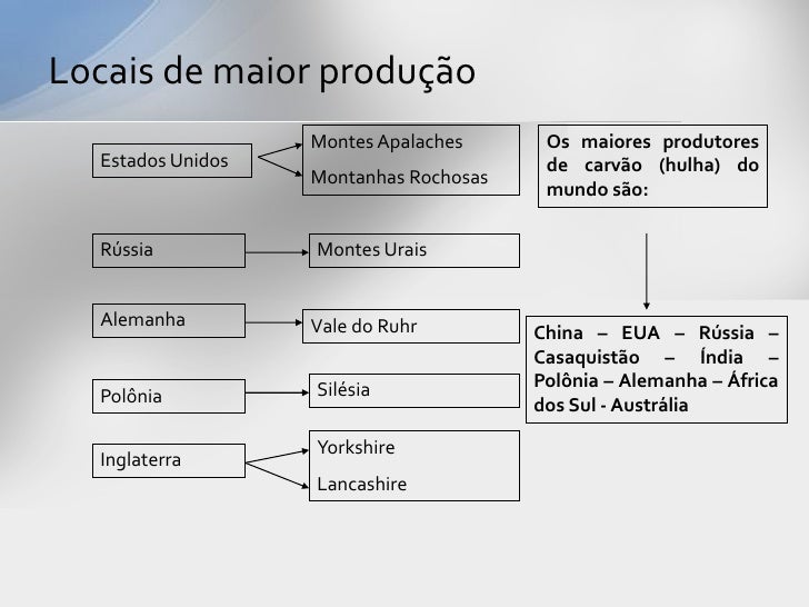 62. 62. Locais de maior produção Montes Apalaches Os maiores produtores Estados Unidos de carvão (hulha) do Montanhas Rochosas mundo são: Rússia Montes Urais Alemanha Vale do Ruhr China – EUA – Rússia – Casaquistão – Índia – Silésia Polônia – Alemanha – África Polônia dos Sul - Austrália Yorkshire Inglaterra Lancashire