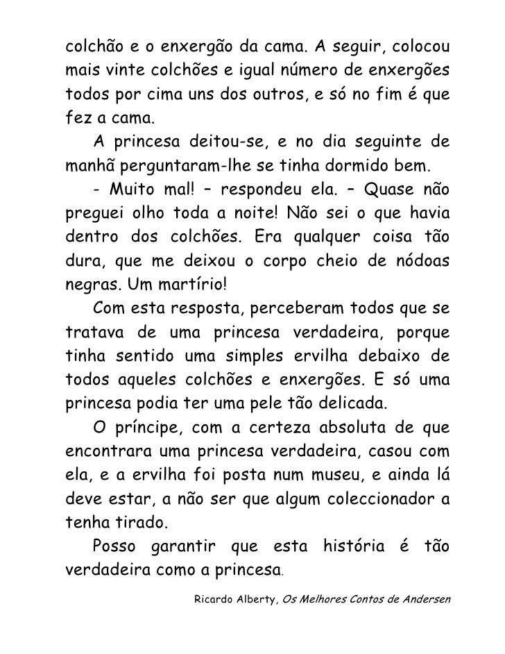 2. 2. colchão e o enxergão da cama. A seguir, colocou mais vinte colchões e igual número de enxergões todos por cima uns dos outros, e só no fim é que fez a cama. A princesa deitou-se, e no dia seguinte de manhã perguntaram-lhe se tinha dormido bem. - Muito mal! – respondeu ela. – Quase não preguei olho toda a noite! Não sei o que havia dentro dos colchões. Era qualquer coisa tão dura, que me deixou o corpo cheio de nódoas negras. Um martírio! Com esta resposta, perceberam todos que se tratava de uma princesa verdadeira, porque tinha sentido uma simples ervilha debaixo de todos aqueles colchões e enxergões. E só uma princesa podia ter uma pele tão delicada. O príncipe, com a certeza absoluta de que encontrara uma princesa verdadeira, casou com ela, e a ervilha foi posta num museu, e ainda lá deve estar, a não ser que algum coleccionador a tenha tirado. Posso garantir que esta história é tão verdadeira como a princesa. Ricardo Alberty, Os Melhores Contos de Andersen