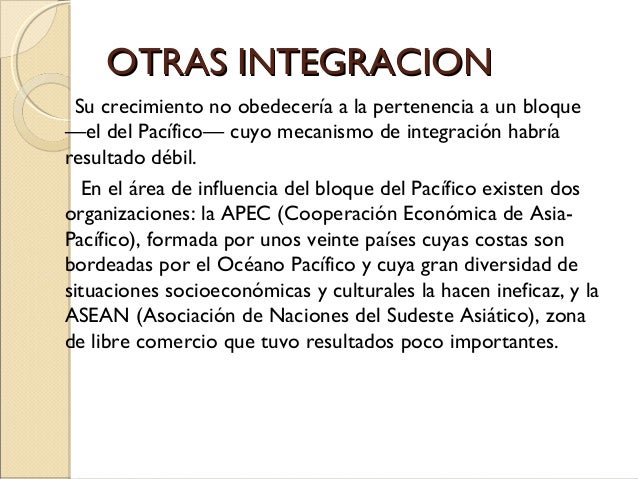 9. 9. OTRAS INTEGRACIONOTRAS INTEGRACION Su crecimiento no obedecería a la pertenencia a un bloque —el del Pacífico— cuyo mecanismo de integración habría resultado débil. En el área de influencia del bloque del Pacífico existen dos organizaciones: la APEC (Cooperación Económica de Asia- Pacífico), formada por unos veinte países cuyas costas son bordeadas por el Océano Pacífico y cuya gran diversidad de situaciones socioeconómicas y culturales la hacen ineficaz, y la ASEAN (Asociación de Naciones del Sudeste Asiático), zona de libre comercio que tuvo resultados poco importantes.