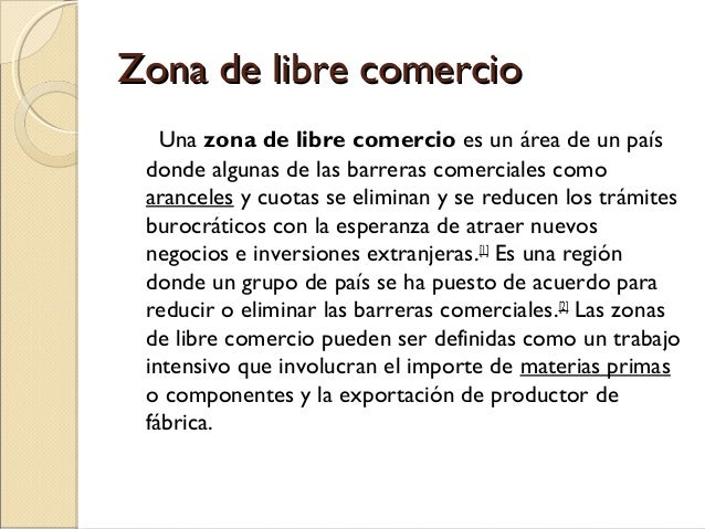 10. 10. Zona de libre comercioZona de libre comercio Una zona de libre comercio es un área de un país donde algunas de las barreras comerciales como aranceles y cuotas se eliminan y se reducen los trámites burocráticos con la esperanza de atraer nuevos negocios e inversiones extranjeras.[1] Es una región donde un grupo de país se ha puesto de acuerdo para reducir o eliminar las barreras comerciales.[2] Las zonas de libre comercio pueden ser definidas como un trabajo intensivo que involucran el importe de materias primas o componentes y la exportación de productor de fábrica.