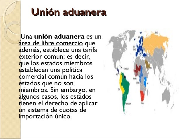 11. 11. Unión aduaneraUnión aduanera Una unión aduanera es un área de libre comercio que además, establece una tarifa exterior común; es decir, que los estados miembros establecen una política comercial común hacia los estados que no son miembros. Sin embargo, en algunos casos, los estados tienen el derecho de aplicar un sistema de cuotas de importación único.