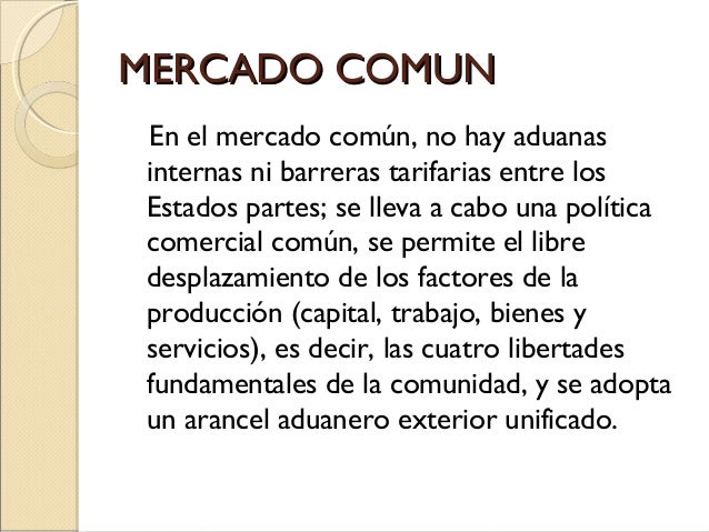 12. 12. MERCADO COMUNMERCADO COMUN En el mercado común, no hay aduanas internas ni barreras tarifarias entre los Estados partes; se lleva a cabo una política comercial común, se permite el libre desplazamiento de los factores de la producción (capital, trabajo, bienes y servicios), es decir, las cuatro libertades fundamentales de la comunidad, y se adopta un arancel aduanero exterior unificado.