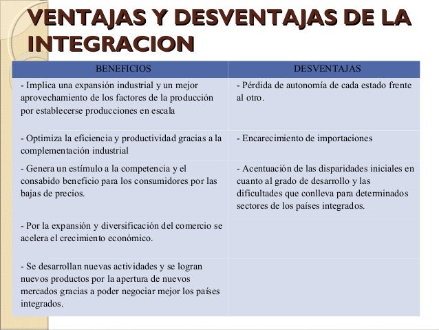 14. 14. VENTAJAS Y DESVENTAJAS DE LAVENTAJAS Y DESVENTAJAS DE LA INTEGRACIONINTEGRACION BENEFICIOS DESVENTAJAS - Implica una expansión industrial y un mejor aprovechamiento de los factores de la producción por establecerse producciones en escala - Pérdida de autonomía de cada estado frente al otro. - Optimiza la eficiencia y productividad gracias a la complementación industrial - Encarecimiento de importaciones - Genera un estímulo a la competencia y el consabido beneficio para los consumidores por las bajas de precios. - Acentuación de las disparidades iniciales en cuanto al grado de desarrollo y las dificultades que conlleva para determinados sectores de los países integrados. - Por la expansión y diversificación del comercio se acelera el crecimiento económico. - Se desarrollan nuevas actividades y se logran nuevos productos por la apertura de nuevos mercados gracias a poder negociar mejor los países integrados.