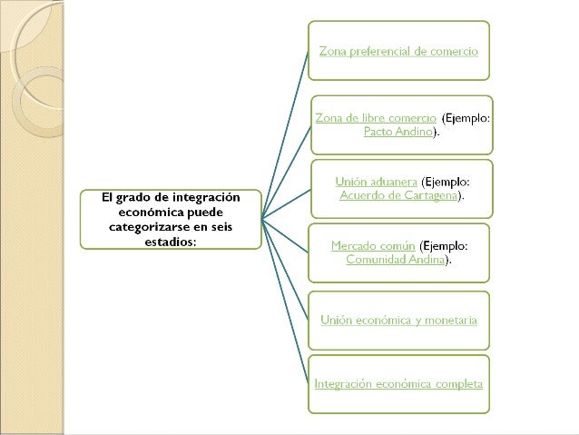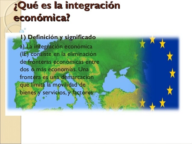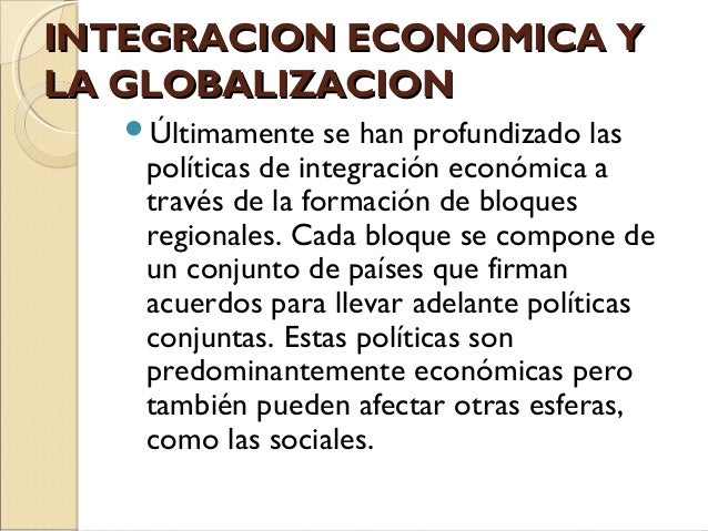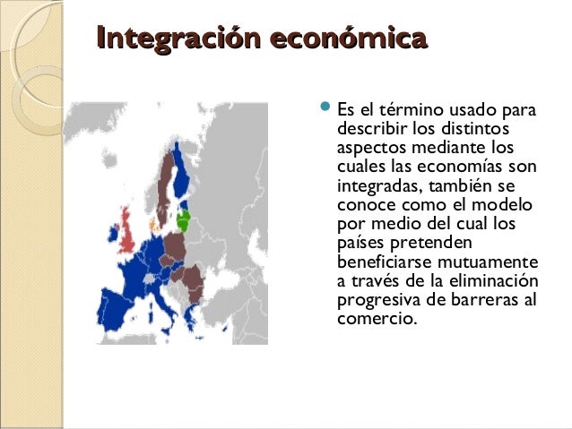 3. 3. Integración económicaIntegración económica Es el término usado para describir los distintos aspectos mediante los cuales las economías son integradas, también se conoce como el modelo por medio del cual los países pretenden beneficiarse mutuamente a través de la eliminación progresiva de barreras al comercio.