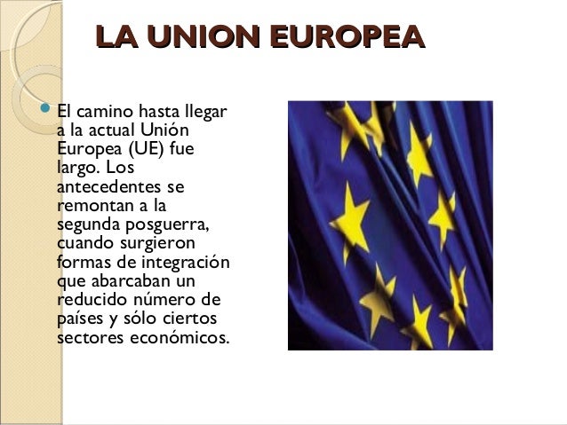 5. 5. LA UNION EUROPEALA UNION EUROPEA El camino hasta llegar a la actual Unión Europea (UE) fue largo. Los antecedentes se remontan a la segunda posguerra, cuando surgieron formas de integración que abarcaban un reducido número de países y sólo ciertos sectores económicos.