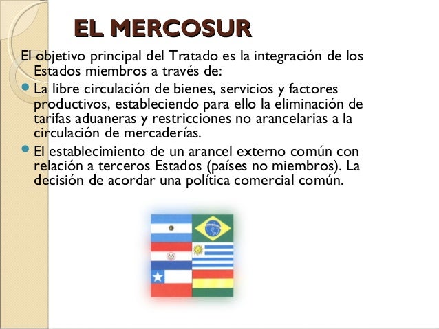 6. 6. EL MERCOSUREL MERCOSUR El objetivo principal del Tratado es la integración de los Estados miembros a través de: La libre circulación de bienes, servicios y factores productivos, estableciendo para ello la eliminación de tarifas aduaneras y restricciones no arancelarias a la circulación de mercaderías. El establecimiento de un arancel externo común con relación a terceros Estados (países no miembros). La decisión de acordar una política comercial común.