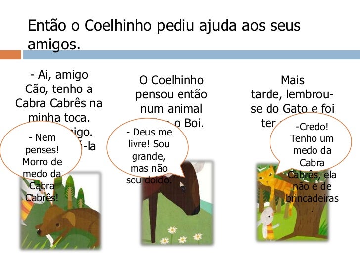 4. 4. Então o Coelhinho pediu ajuda aos seus amigos.<br />- Ai, amigo Cão, tenho a Cabra Cabrês na minha toca. Vem comigo. Ajuda a tirá-la de lá.<br />O Coelhinho pensou então num animal maior, o Boi.<br />Mais tarde, lembrou-se do Gato e foi ter com ele.<br />-Credo! Tenho um medo da Cabra Cabrês, ela não é de brincadeiras.<br />- Deus me livre! Sou grande, mas não sou doido.<br />- Nem penses! Morro de medo da Cabra Cabrês!<br />