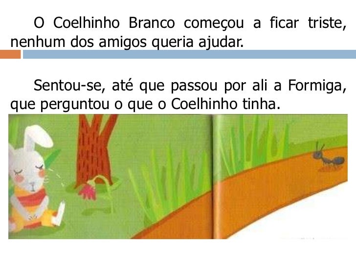 5. 5. O Coelhinho Branco começou a ficar triste, nenhum dos amigos queria ajudar. <br />Sentou-se, até que passou por ali a Formiga, que perguntou o que o Coelhinho tinha. <br />