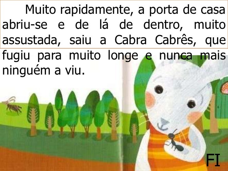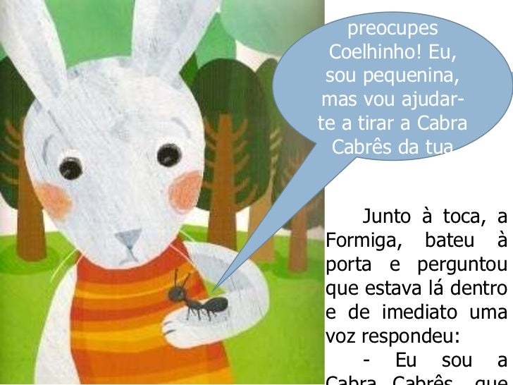 6. 6. - Não te preocupes Coelhinho! Eu, sou pequenina, mas vou ajudar-te a tirar a Cabra Cabrês da tua casa.<br /> Junto à toca, a Formiga, bateu à porta e perguntou que estava lá dentro e de imediato uma voz respondeu:<br /> - Eu sou a Cabra Cabrês, que te salto em cima e te faço em três!<br />