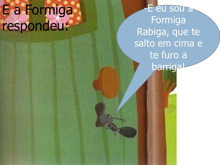 7. 7. E a Formiga respondeu:<br />-E eu sou a Formiga Rabiga, que te salto em cima e te furo a barriga!<br />