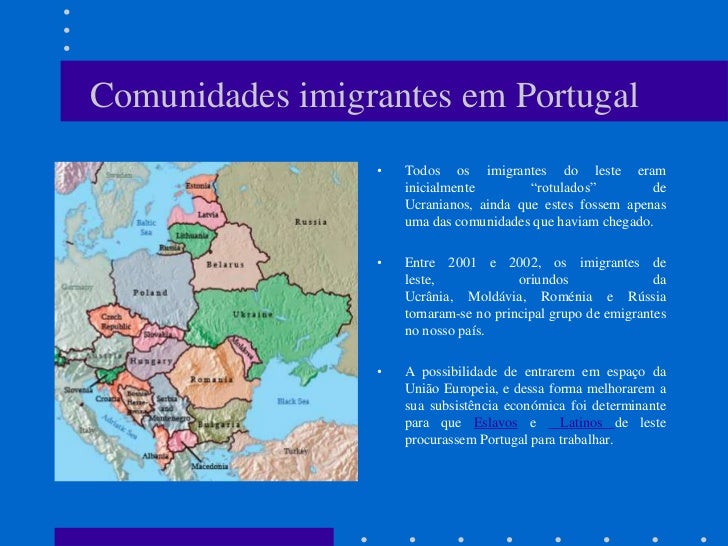 9. 9. Comunidades imigrantes em Portugal • Todos os imigrantes do leste eram inicialmente “rotulados” de Ucranianos, ainda que estes fossem apenas uma das comunidades que haviam chegado. • Entre 2001 e 2002, os imigrantes de leste, oriundos da Ucrânia, Moldávia, Roménia e Rússia tornaram-se no principal grupo de emigrantes no nosso país. • A possibilidade de entrarem em espaço da União Europeia, e dessa forma melhorarem a sua subsistência económica foi determinante para que Eslavos e Latinos de leste procurassem Portugal para trabalhar.