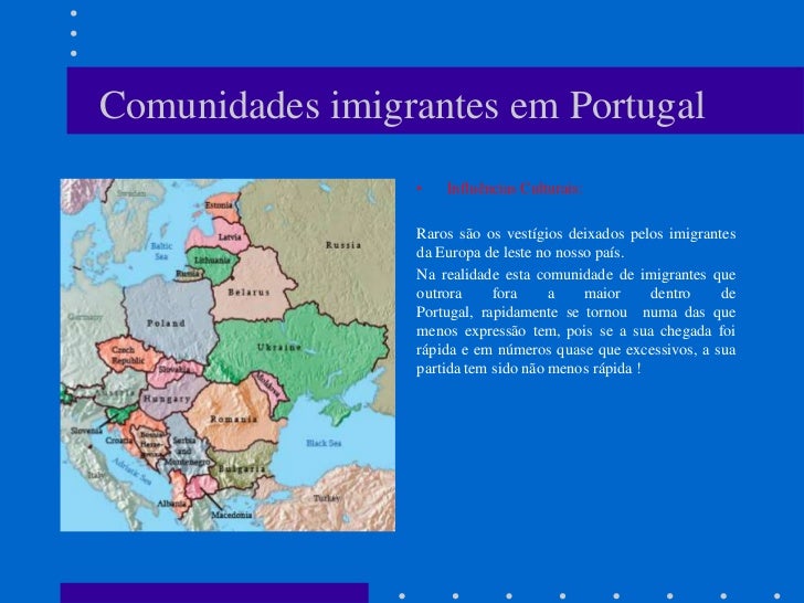 10. 10. Comunidades imigrantes em Portugal • Influências Culturais: Raros são os vestígios deixados pelos imigrantes da Europa de leste no nosso país. Na realidade esta comunidade de imigrantes que outrora fora a maior dentro de Portugal, rapidamente se tornou numa das que menos expressão tem, pois se a sua chegada foi rápida e em números quase que excessivos, a sua partida tem sido não menos rápida !