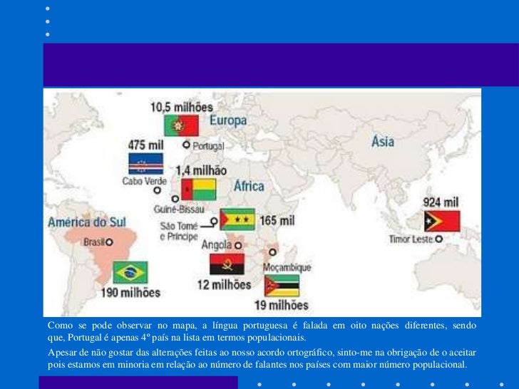 12. 12. Como se pode observar no mapa, a língua portuguesa é falada em oito nações diferentes, sendoque, Portugal é apenas 4º país na lista em termos populacionais.Apesar de não gostar das alterações feitas ao nosso acordo ortográfico, sinto-me na obrigação de o aceitarpois estamos em minoria em relação ao número de falantes nos países com maior número populacional.