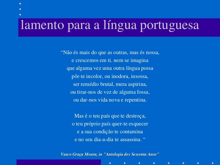 14. 14. lamento para a língua portuguesa “Não és mais do que as outras, mas és nossa, e crescemos em ti. nem se imagina que alguma vez uma outra língua possa pôr-te incolor, ou inodora, insossa, ser remédio brutal, mera aspirina, ou tirar-nos de vez de alguma fossa, ou dar-nos vida nova e repentina. Mas é o teu país que te destroça, o teu próprio país quer-te esquecer e a sua condição te contamina e no seu dia-a-dia te assassina. “ Vasco Graça Moura, in "Antologia dos Sessenta Anos"