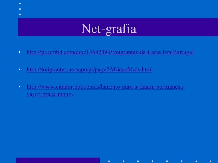 15. 15. Net-grafia• http://pt.scribd.com/doc/14682899/Imigrantes-de-Leste-Em-Portugal• http://imigrantes.no.sapo.pt/page2AfricanMuls.html• http://www.citador.pt/poemas/lamento-para-a-lingua-portuguesa- vasco-graca-moura