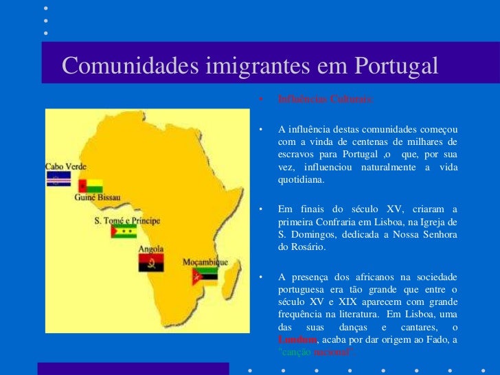 3. 3. Comunidades imigrantes em Portugal • Influências Culturais: • A influência destas comunidades começou com a vinda de centenas de milhares de escravos para Portugal ,o que, por sua vez, influenciou naturalmente a vida quotidiana. • Em finais do século XV, criaram a primeira Confraria em Lisboa, na Igreja de S. Domingos, dedicada a Nossa Senhora do Rosário. • A presença dos africanos na sociedade portuguesa era tão grande que entre o século XV e XIX aparecem com grande frequência na literatura. Em Lisboa, uma das suas danças e cantares, o Lundum, acaba por dar origem ao Fado, a "canção nacional".