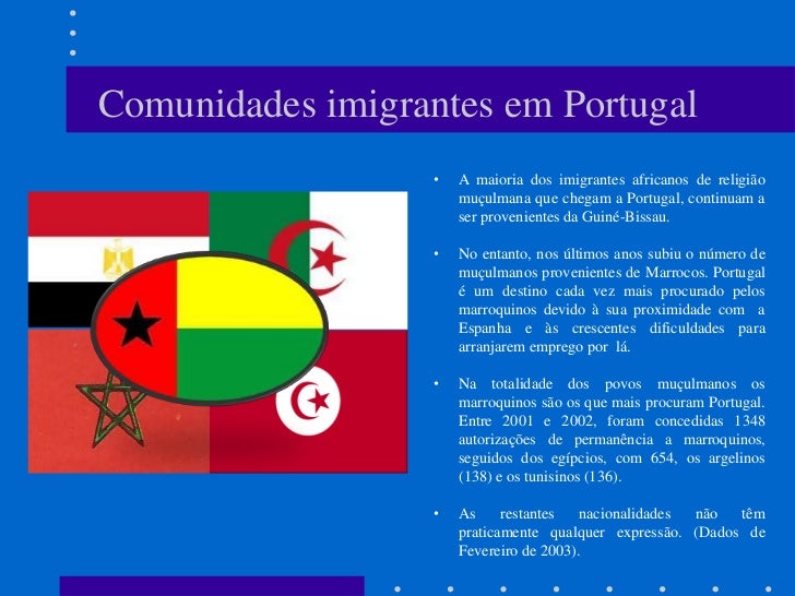 4. 4. Comunidades imigrantes em Portugal • A maioria dos imigrantes africanos de religião muçulmana que chegam a Portugal, continuam a ser provenientes da Guiné-Bissau. • No entanto, nos últimos anos subiu o número de muçulmanos provenientes de Marrocos. Portugal é um destino cada vez mais procurado pelos marroquinos devido à sua proximidade com a Espanha e às crescentes dificuldades para arranjarem emprego por lá. • Na totalidade dos povos muçulmanos os marroquinos são os que mais procuram Portugal. Entre 2001 e 2002, foram concedidas 1348 autorizações de permanência a marroquinos, seguidos dos egípcios, com 654, os argelinos (138) e os tunisinos (136). • As restantes nacionalidades não têm praticamente qualquer expressão. (Dados de Fevereiro de 2003).