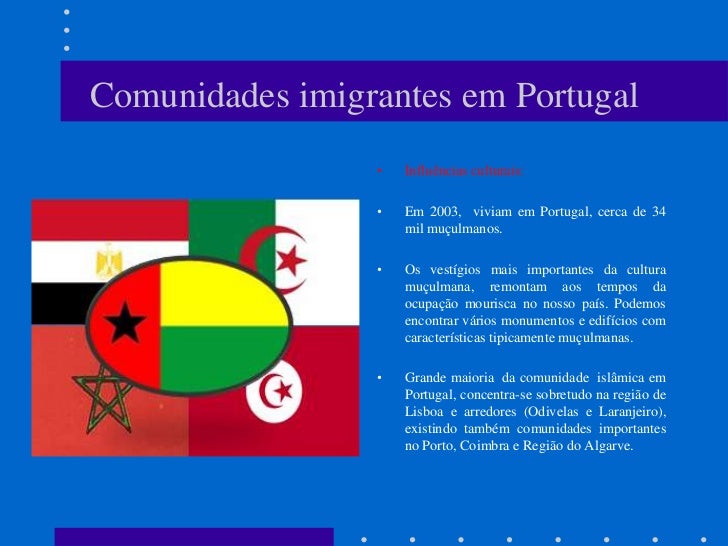 5. 5. Comunidades imigrantes em Portugal • Influências culturais: • Em 2003, viviam em Portugal, cerca de 34 mil muçulmanos. • Os vestígios mais importantes da cultura muçulmana, remontam aos tempos da ocupação mourisca no nosso país. Podemos encontrar vários monumentos e edifícios com características tipicamente muçulmanas. • Grande maioria da comunidade islâmica em Portugal, concentra-se sobretudo na região de Lisboa e arredores (Odivelas e Laranjeiro), existindo também comunidades importantes no Porto, Coimbra e Região do Algarve.