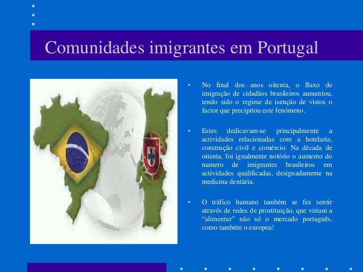 6. 6. Comunidades imigrantes em Portugal • No final dos anos oitenta, o fluxo de imigração de cidadãos brasileiros aumentou, tendo sido o regime de isenção de vistos o factor que precipitou este fenómeno. • Estes dedicavam-se principalmente a actividades relacionadas com a hotelaria, construção civil e comércio. Na década de oitenta, foi igualmente notório o aumento do numero de imigrantes brasileiros em actividades qualificadas, designadamente na medicina dentária. • O tráfico humano também se fez sentir através de redes de prostituição, que viriam a “alimentar” não só o mercado português, como também o europeu!