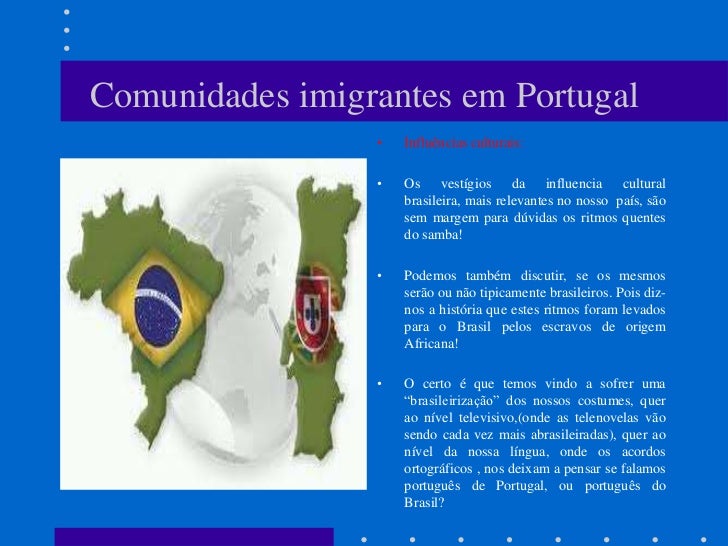 7. 7. Comunidades imigrantes em Portugal • Influências culturais: • Os vestígios da influencia cultural brasileira, mais relevantes no nosso país, são sem margem para dúvidas os ritmos quentes do samba! • Podemos também discutir, se os mesmos serão ou não tipicamente brasileiros. Pois diz- nos a história que estes ritmos foram levados para o Brasil pelos escravos de origem Africana! • O certo é que temos vindo a sofrer uma “brasileirização” dos nossos costumes, quer ao nível televisivo,(onde as telenovelas vão sendo cada vez mais abrasileiradas), quer ao nível da nossa língua, onde os acordos ortográficos , nos deixam a pensar se falamos português de Portugal, ou português do Brasil?