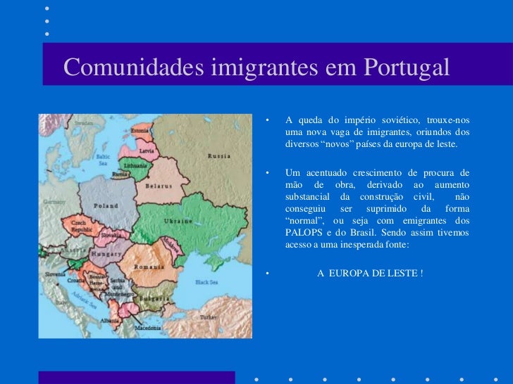 8. 8. Comunidades imigrantes em Portugal • A queda do império soviético, trouxe-nos uma nova vaga de imigrantes, oriundos dos diversos “novos” países da europa de leste. • Um acentuado crescimento de procura de mão de obra, derivado ao aumento substancial da construção civil, não conseguiu ser suprimido da forma “normal”, ou seja com emigrantes dos PALOPS e do Brasil. Sendo assim tivemos acesso a uma inesperada fonte: • A EUROPA DE LESTE !